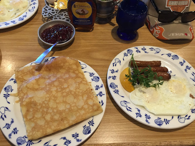 We both ordered Swedish pancake with eggs & meat. Above Dusty got the Swedish meatballs. Below Tic got "normal" sausage. The Swedish meatballs were made with lean beef, crackers, eggs & special spices. They were much leaner than Tic's sausage. Tic finished my Swedish pancake. We were both stuffed.